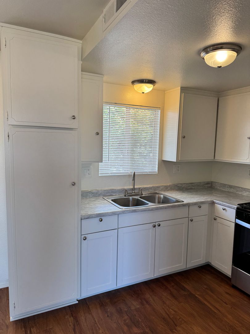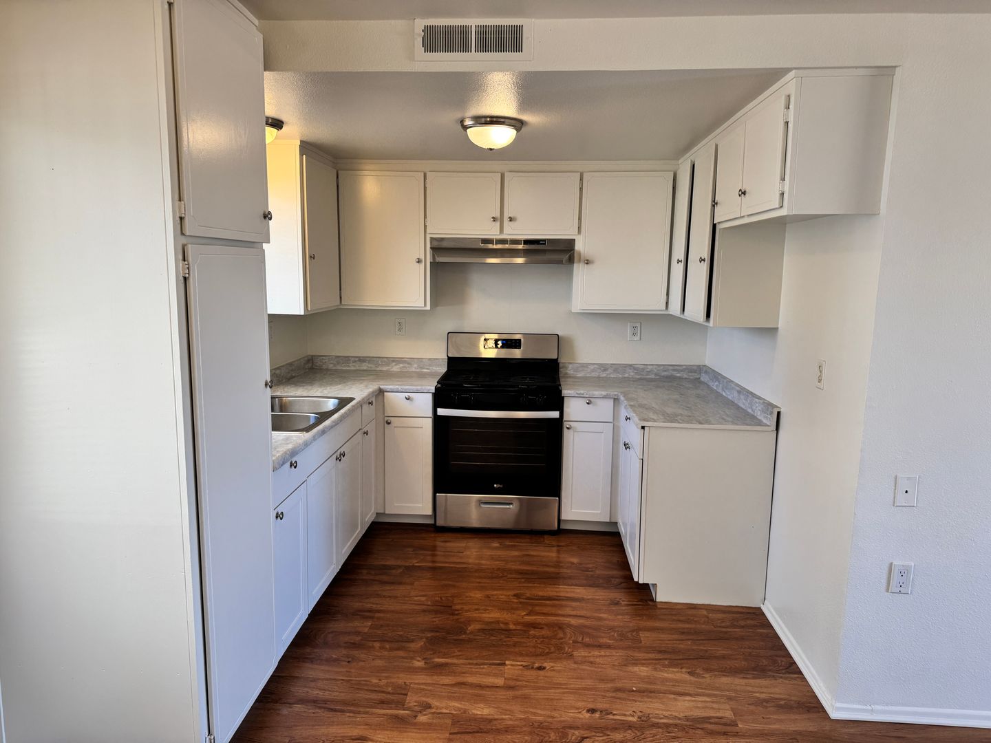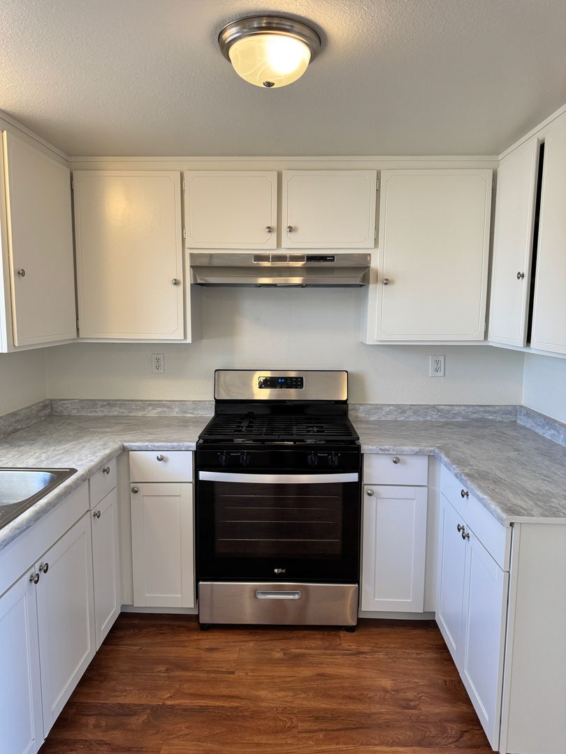 The kitchen boasts modern elegance with new cabinetry, countertops, a stainless steel sink, and a sleek stainless steel stove complete with a range hood fan. Ample storage space ensures everything has its place.